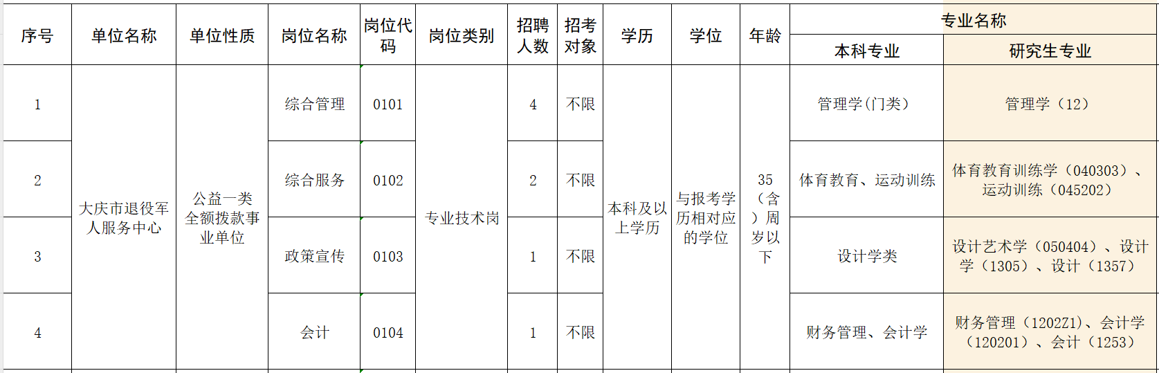 計(jì)劃公開(kāi)招聘9名工作人員,其中大慶市退役軍人服務(wù)中心8名、大慶市軍用飲食供應(yīng)站1名。(詳見(jiàn)《2023年大慶市退役軍人事務(wù)局所屬事業(yè)單位公開(kāi)招聘崗位計(jì)劃表》)(附件1)