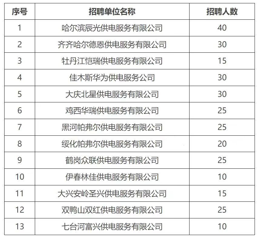 2024年黑龍江省各地供電服務公司共計劃招聘300人,招聘崗位全部為各供電服務公司鄉(xiāng)鎮(zhèn)供電服務一線技能崗位。各公司按照所屬地區(qū)進行招聘,錄用后進行二次分配,派駐至鄉(xiāng)鎮(zhèn)供電所從事委托業(yè)務,具體需求如下:
